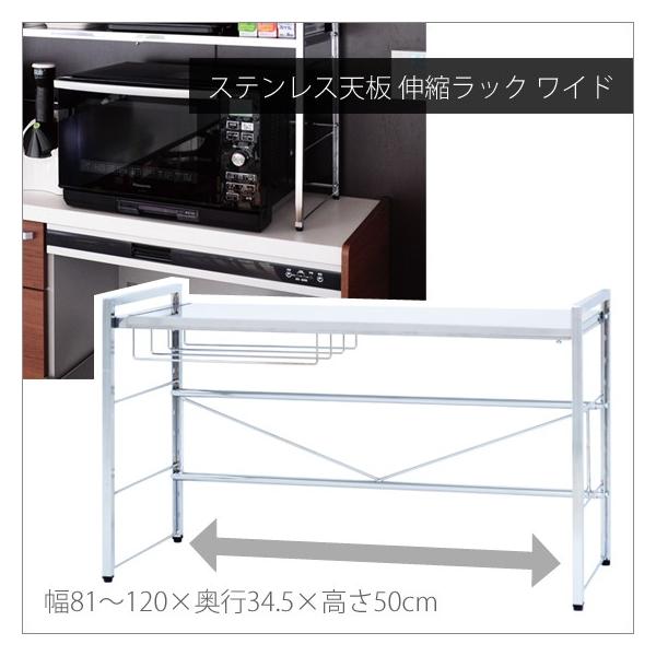レンジ台 ステンレス天板伸縮ラックワイド幅81 120奥行35高さ50キッチンシンク上置き棚小物ラップ収納幅の広さ調節頑丈夫清潔日本製 足立製作所