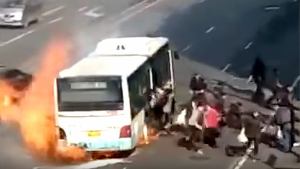 動画中国バス火災乗客が雪崩を打って逃げ出す早く逃げて
