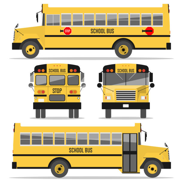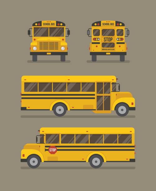 学校の前の学校のバスの後ろに走っている少女のイラストの