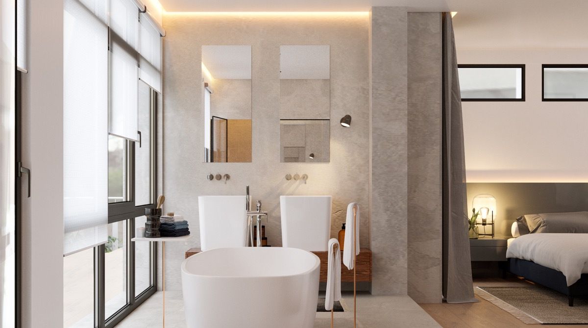 豪华浴缸近窗三维渲染浴室设计图片素材 现代豪华浴缸的浴室渲染