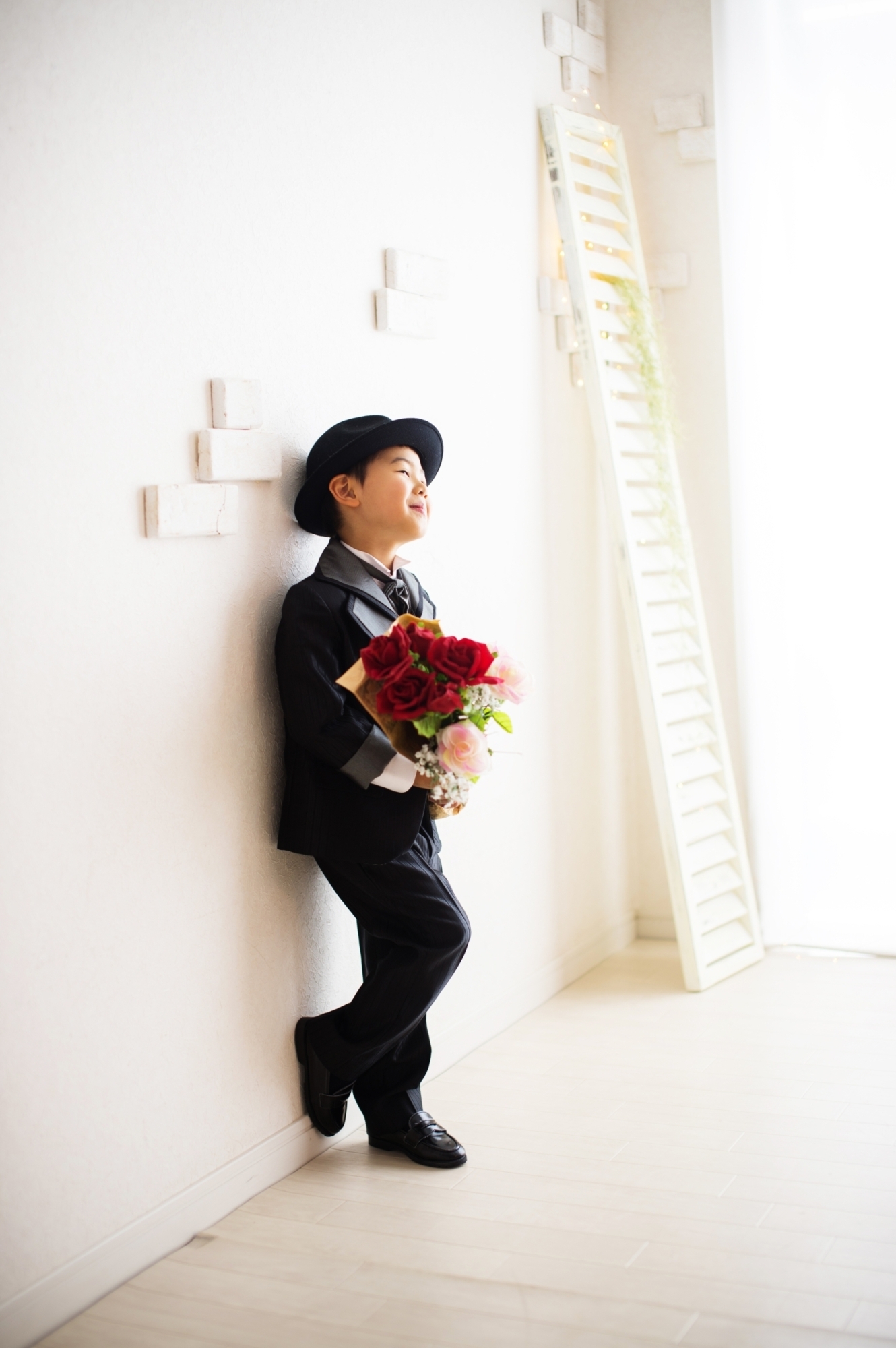 洋装スーツスタイルでの5歳男の子の七五三移動中やふとした一